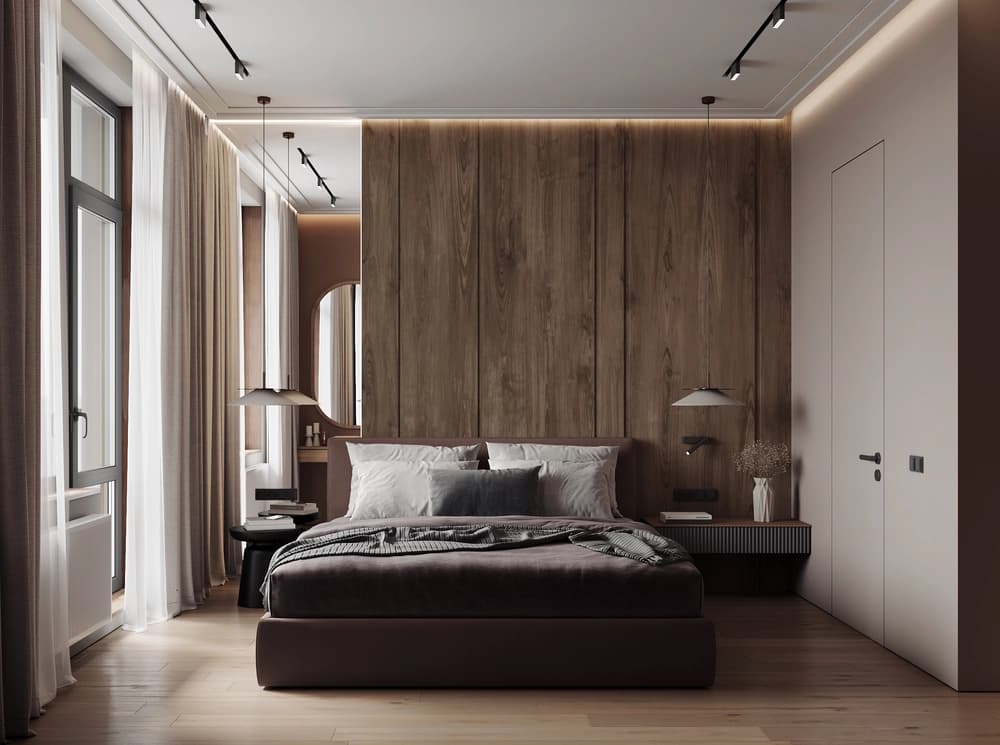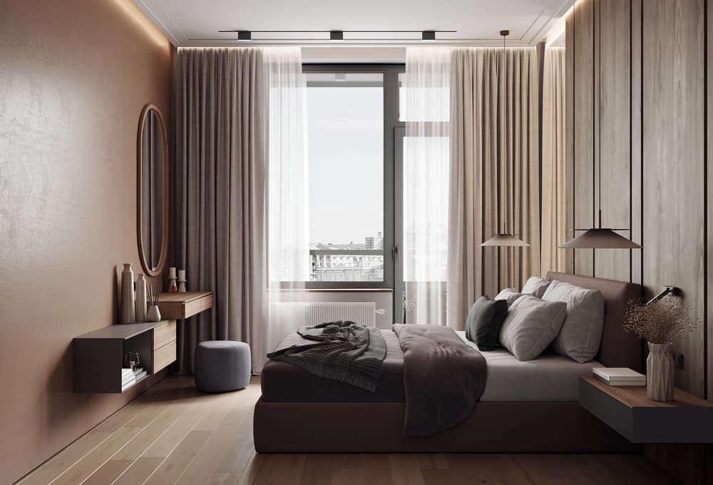 В спальне гармония достигнута деревянными панелями у изголовья, зеркалом во всю высоту у стены с окном и плотными блэкаут шторами, создающими уют и умиротворение.