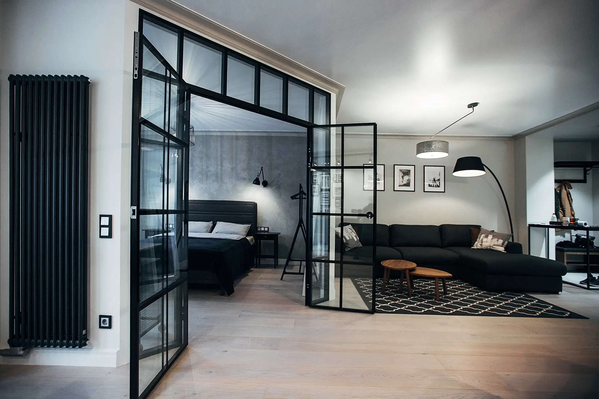 Изначально это была типовая однокомнатная квартира, но нам удалось сделать открытое пространство необычной формы, наполненное светом и воздухом, просторное и уютное. Двери в ванную скрыты, а в спальню выполнены как стеклянные распашные створки — открыв их, можно полностью окинуть взглядом всю квартиру.