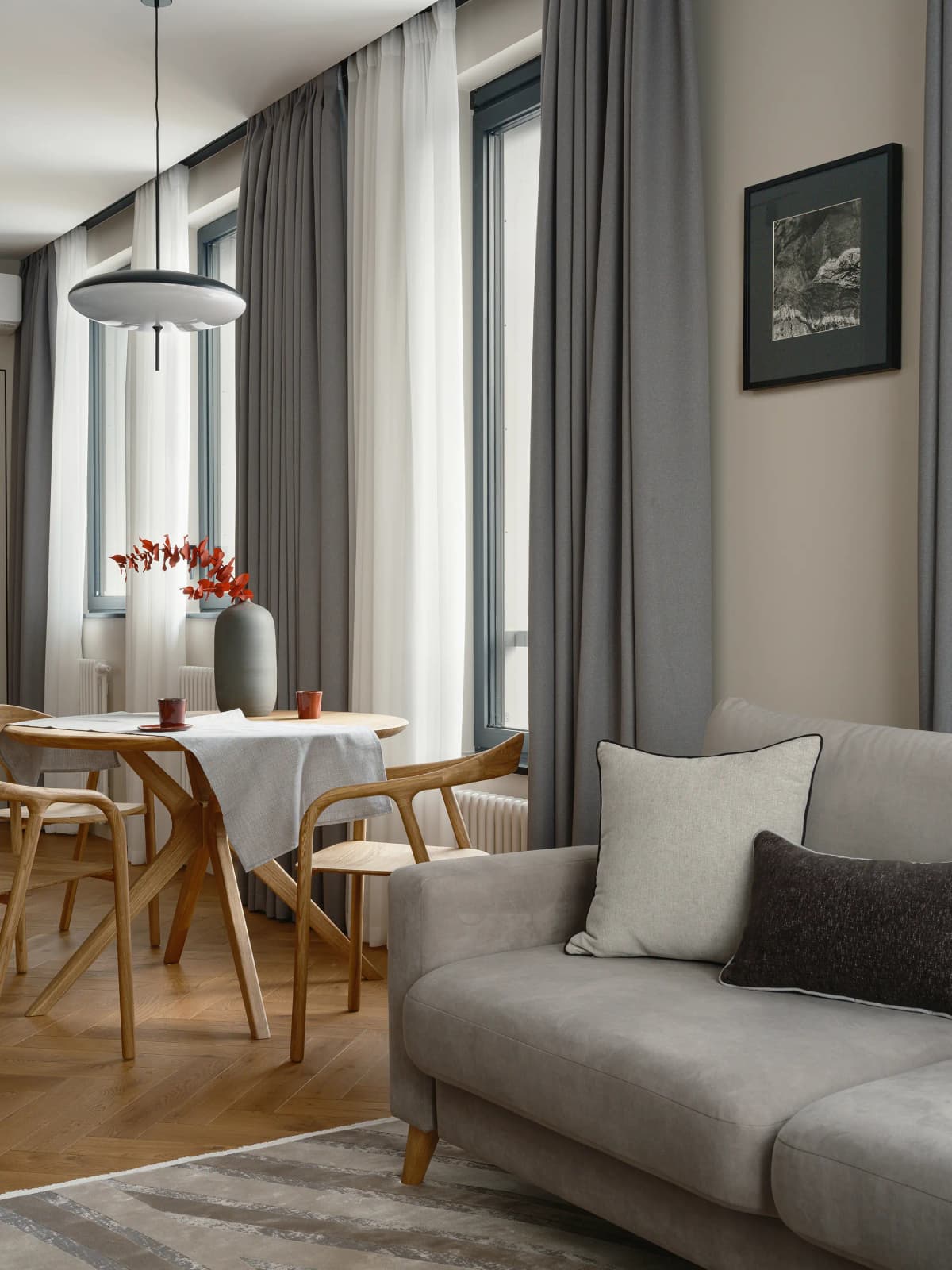Квартира угловая, в ней целых восемь окон — света много в любое время дня. Стилистически мы сделали всё довольно аскетично, без лишнего декора. Акценты — за счёт цвета: в кабинете глубокий зелёный, в прихожей — чёрный, а в спальне — насыщенный красный. Тепла гостиной добавляет дерево — шпоном отделали дверь в кабинет и часть стены и использовали разные оттенки дерева в мебели.