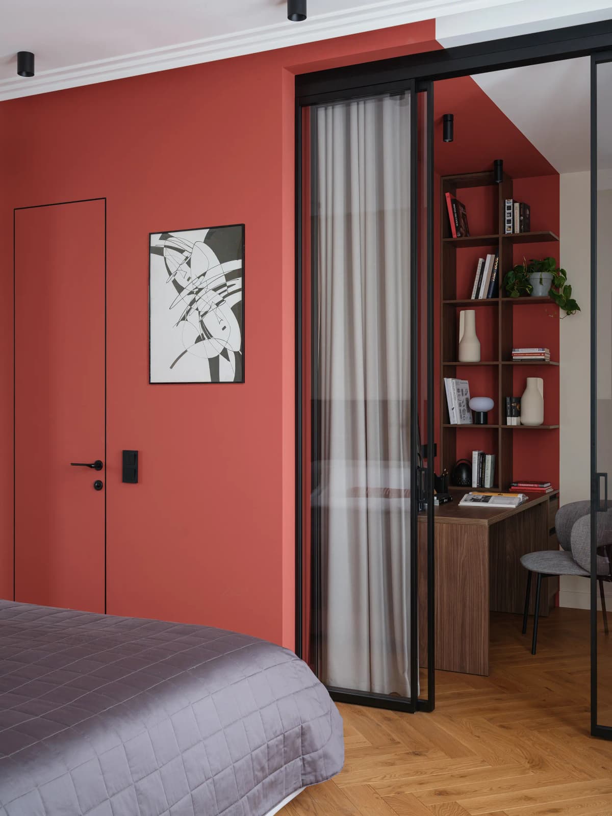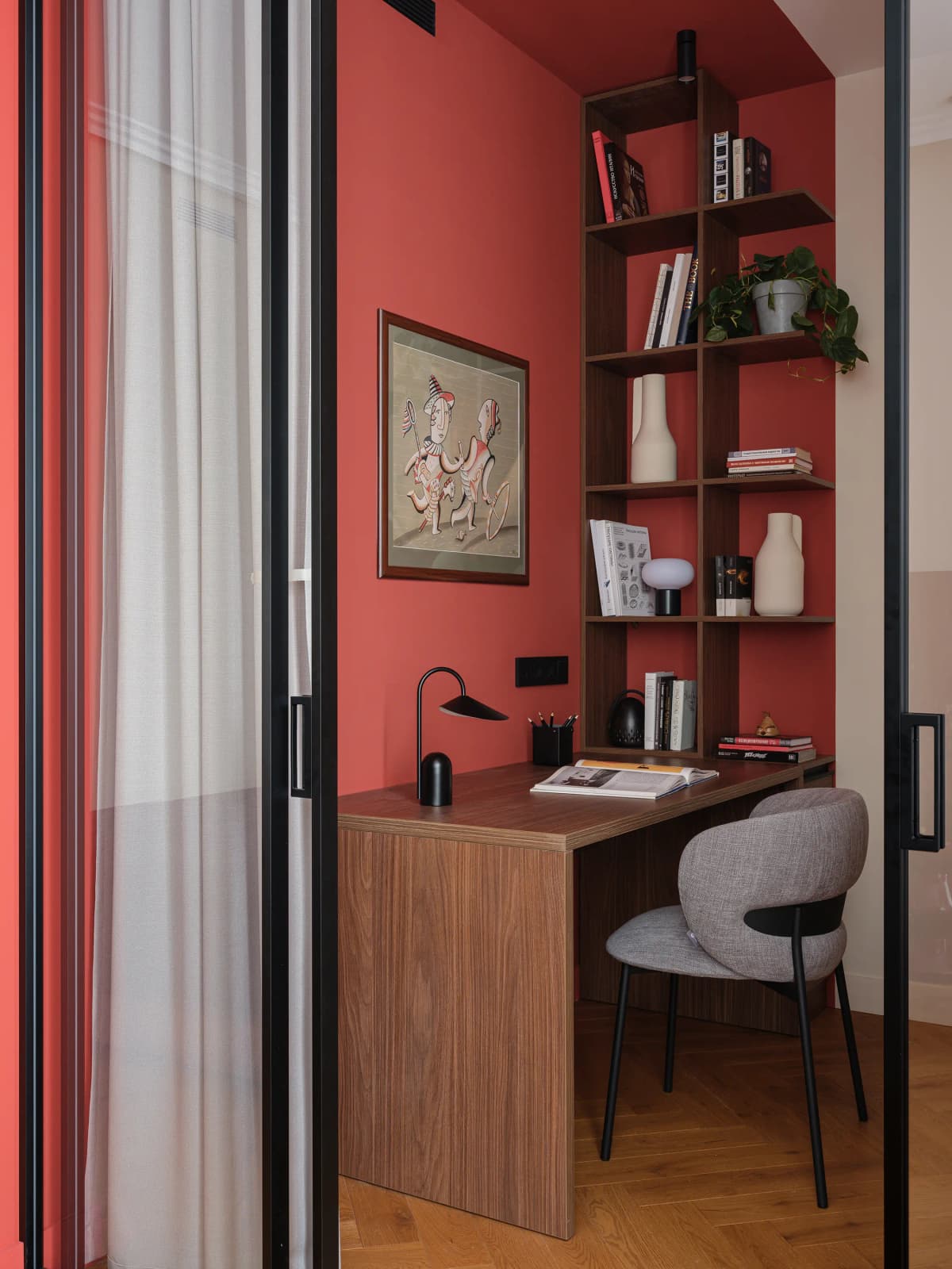 Плюс в спальне есть ещё один небольшой мини-кабинет — это было принципиально важно, потому что оба заказчика часто работают из дома.