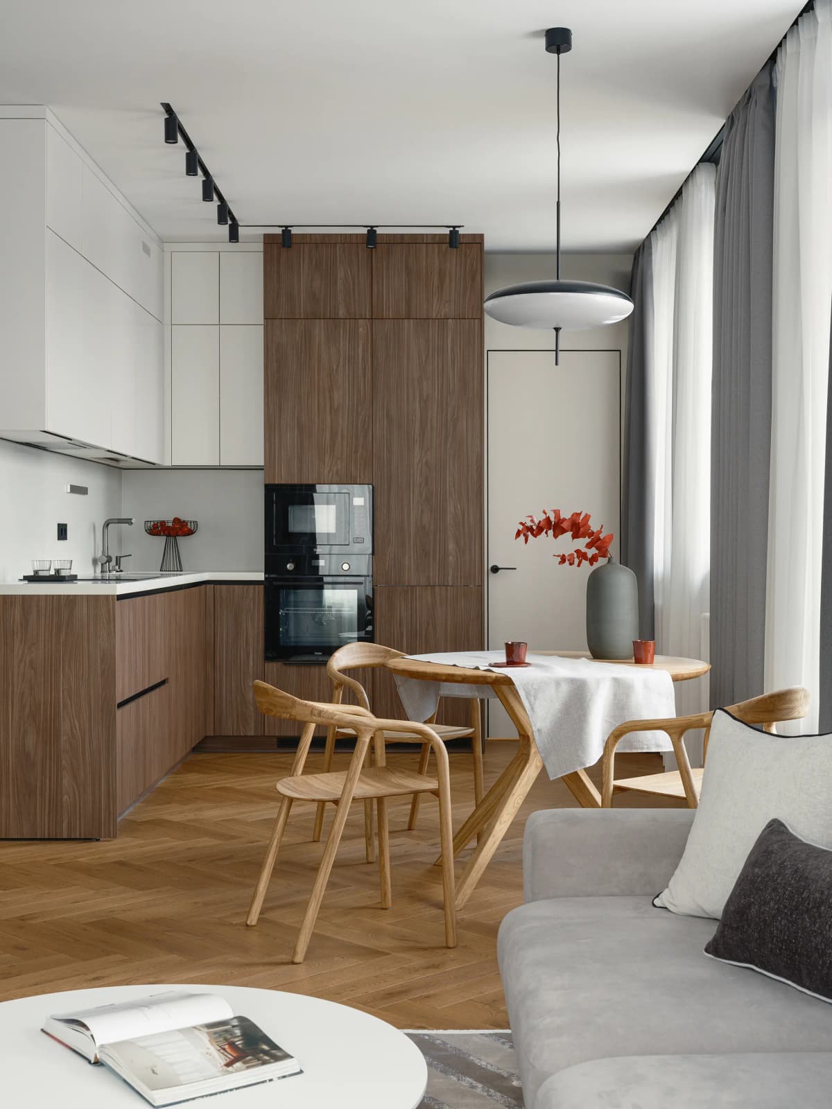 Корпусную мебель и кухню изготовили на заказ у российского производителя, а мягкая мебель — от SK Design. Освещение построено на встроенных треках, и только над обеденным столом есть акцент — подвесной светильник.