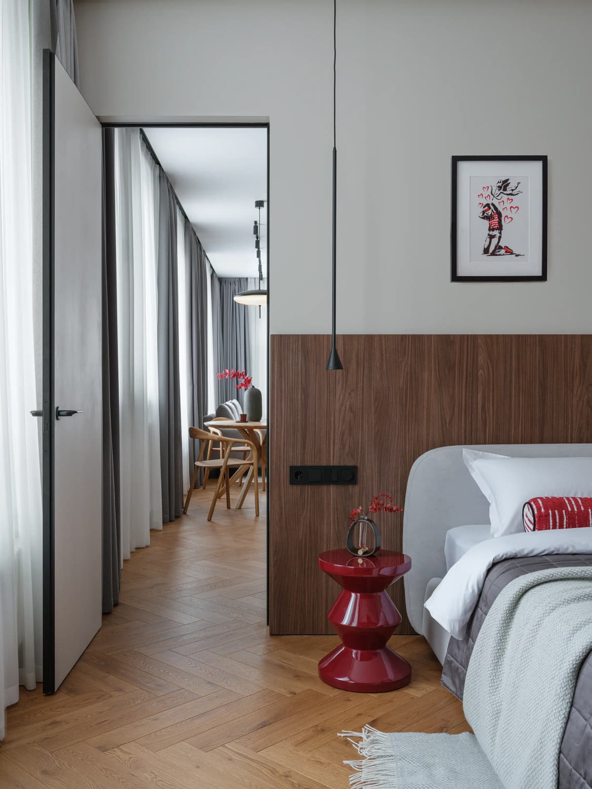 В итоге решили особо не «ломать» — сделали только точечные изменения: добавили гардеробную в спальне, перенесли вход в ванную, чтобы выделить рабочую зону, и немного расширили гостиную. Хотя, признаюсь, соблазн всё переделать был :)