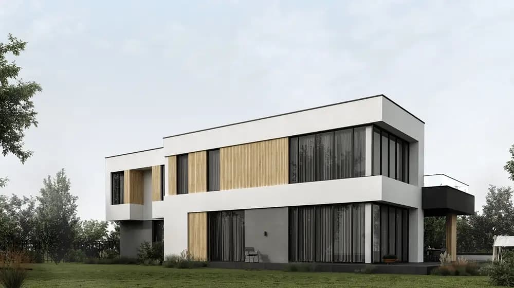 Фасады выполнили в 3 материалах: черная и белая штукатурка и облицовка планкеном.