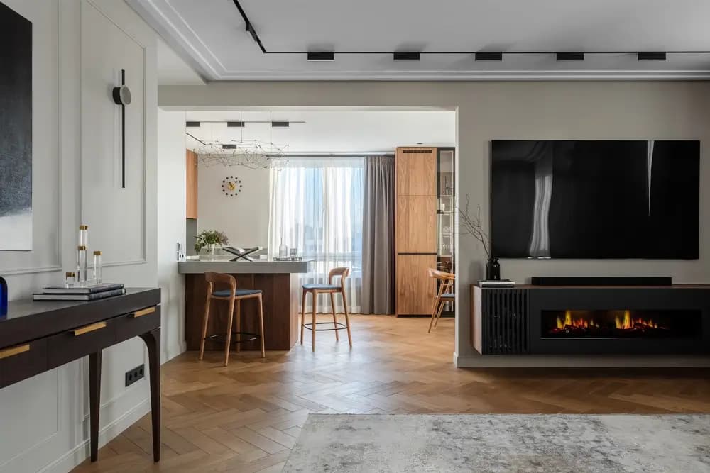 Зону кухни и гостиной разделяет стена с интегрированным электрокамином. На ней, напротив дивана, размещен телевизор.