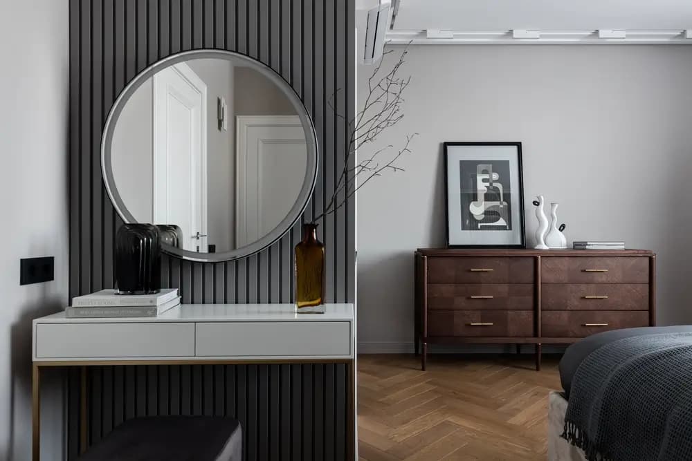 В мастер-спальне, помимо кровати, разместили небольшой туалетный столик с круглым зеркалом и комод для вещей.