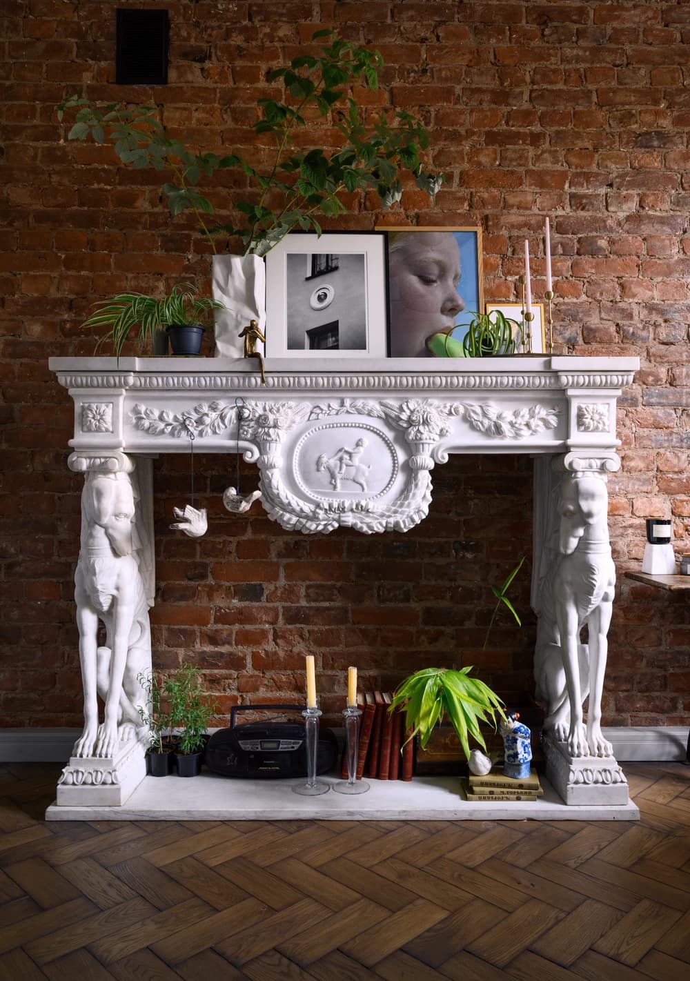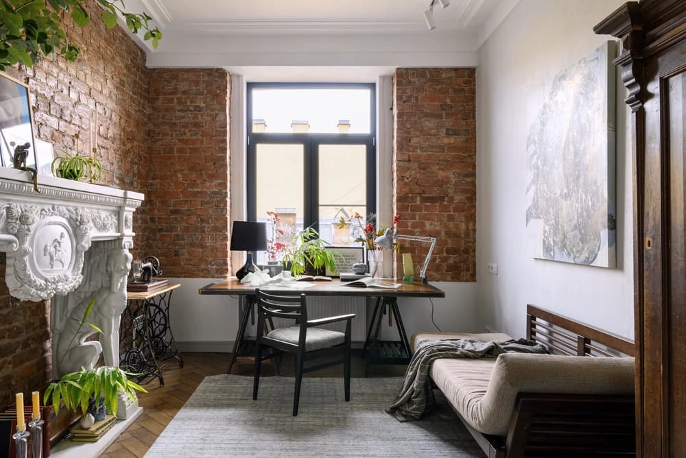 В кабинете тоже есть своя изюминка – старинный мраморный портал для камина на фоне кирпичной стены. Жалко было его выбрасывать, и он идеально вписался в лаконичный интерьер комнаты.