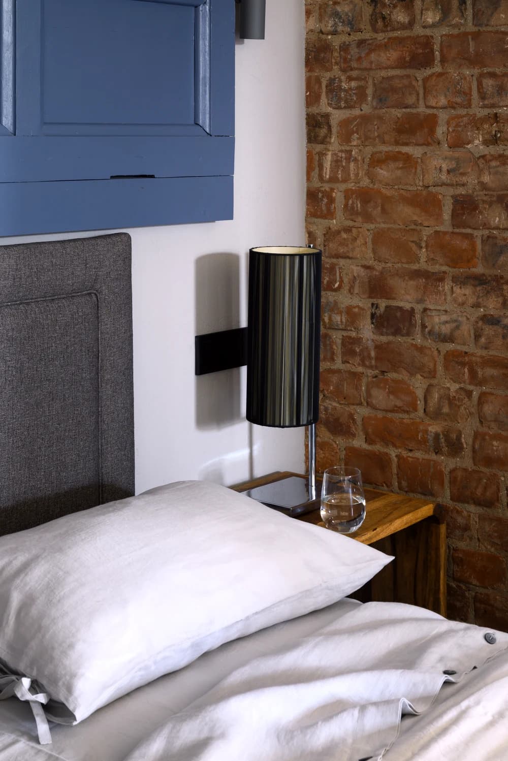 Атмосферу в спальне создает изголовье из старого мебельного фасада от шкафа и картина на стене.
