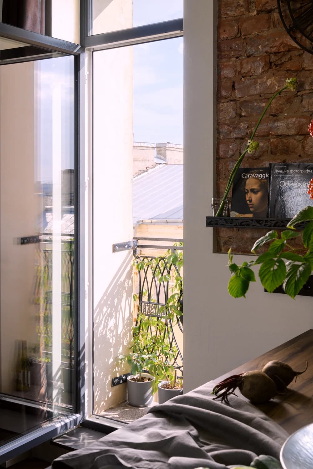 Изначально в этом помещении было 2 окна с видом на двор-колодец. Освещения было недостаточно. Благодаря тому, что мы проделали 2 проема в брандмауэрной стене пространство наполнилось естественным светом и воздухом. При этом один оконный проем мы решили заменить на французский балкон, с которого открывается потрясающий вид на крыши Петербурга.