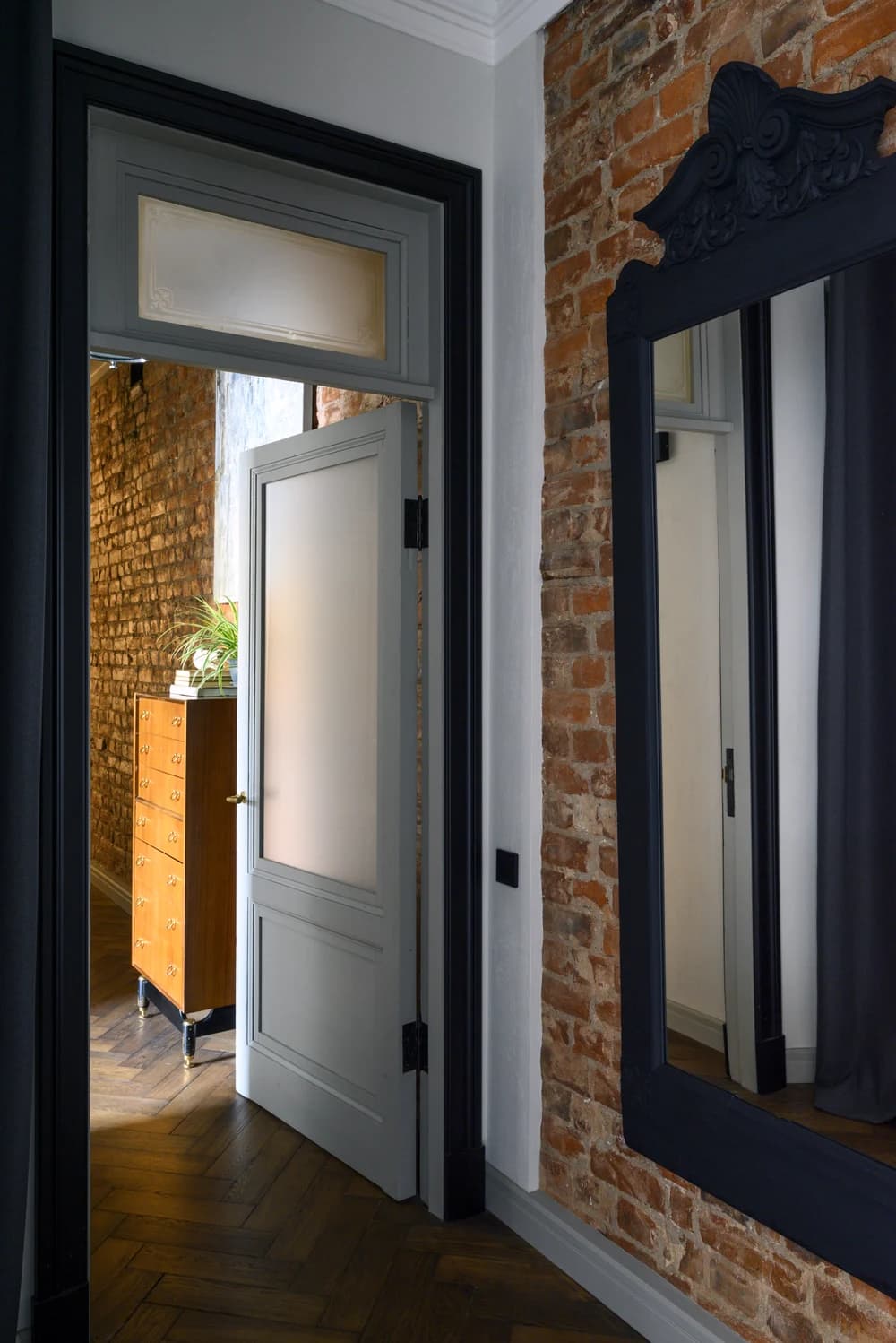 Большинство кирпичных несущих стен не стали отделывать штукатуркой: просто очистили и покрыли прозрачным матовым лаком. Те стены, которые все-таки решили не оставлять в кирпиче, а также новые перегородки оштукатурили и покрасили в сдержанный классический серый цвет. Такую светлую базу в дальнейшем декорировали живописью и фотографиями.